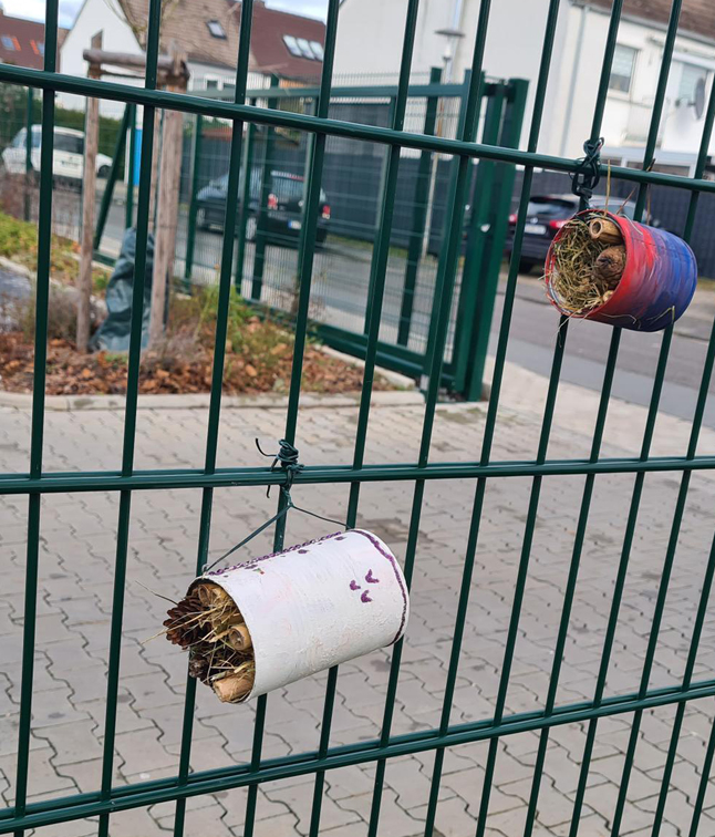 Ein weiteres Projekt der Schulgarten AG war das Bauen von Insektenhotels aus alten Blechdosen, die nun unser Schulgelände verschönern. Im Schulgarten haben die Kinder die Hochbeete mit Kräutern und Gemüse bepflanzt.