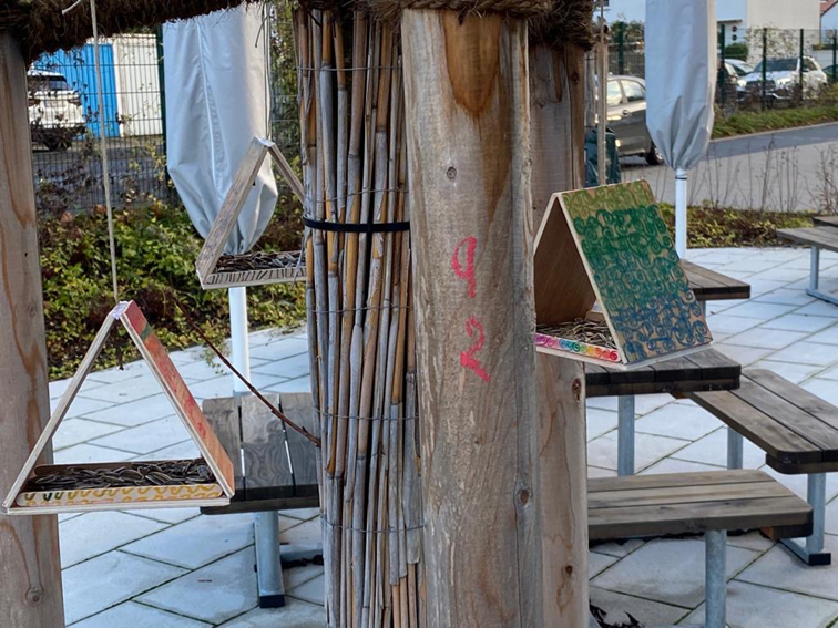 Unter anderem haben die Kinder in der kalten Jahreszeit Futterhäuser für Vögel gebaut. Es musste viel Material besorgt werden, um die Vogelhäuser zu bauen. Die Kinder waren mit großem Eifer dabei berichtet Bianca. Es wurde überlegt, wie die Häuser aussehen sollen und dann gemeinsam zur Tat geschritten. Als die Futterhäuser fertig waren und befüllt mit Bio-Sonnenblumenkernen (Eigenanbau im Schulgarten) wurden, haben sie diese gemeinsam im Schulgarten angebracht.